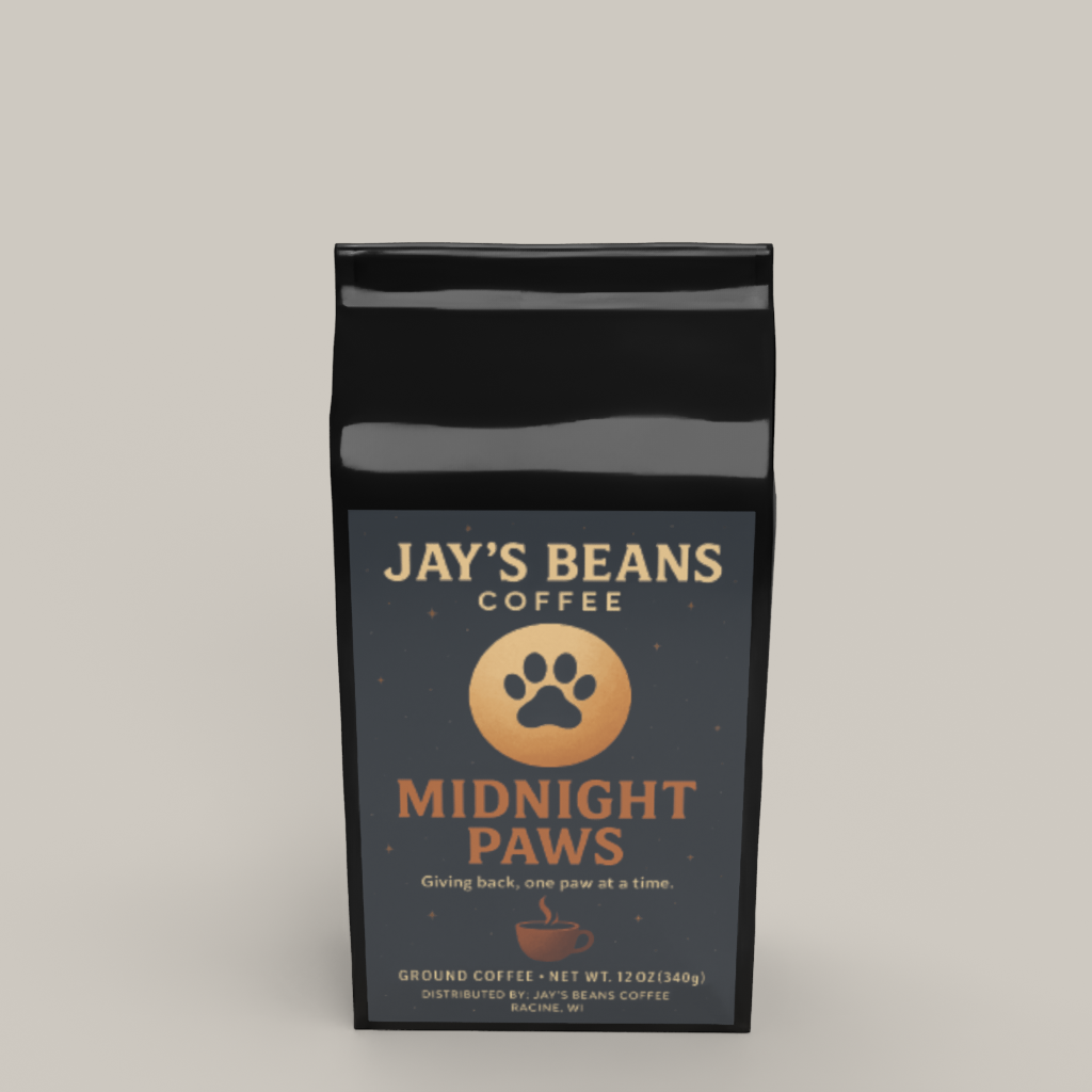 Every bag of Midnight Paws helps give back—supporting rescue shelters and pets in need. With each sip, you’re not only enjoying exceptional coffee, you’re becoming part of the Jay’s Beans Coffee mission: “Giving back, one paw at a time.”